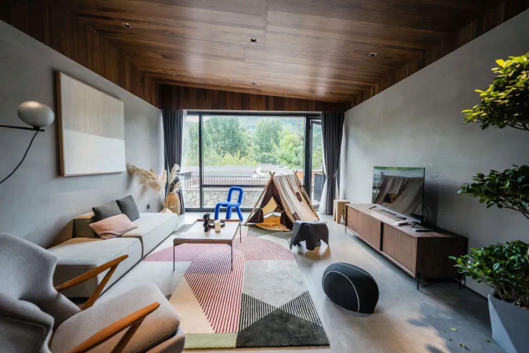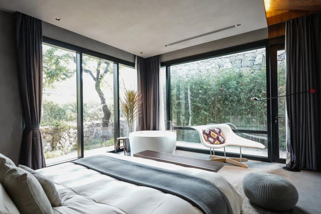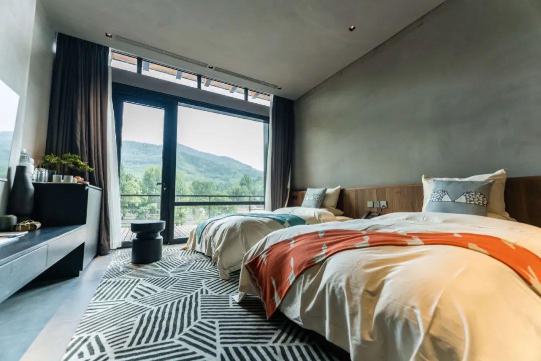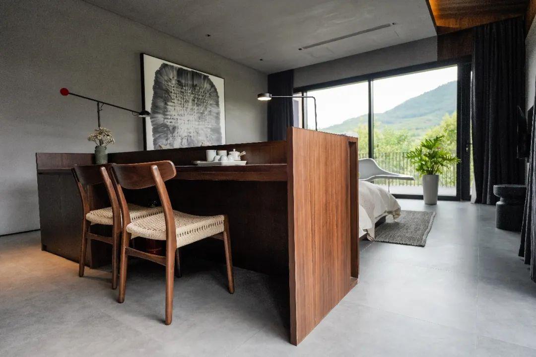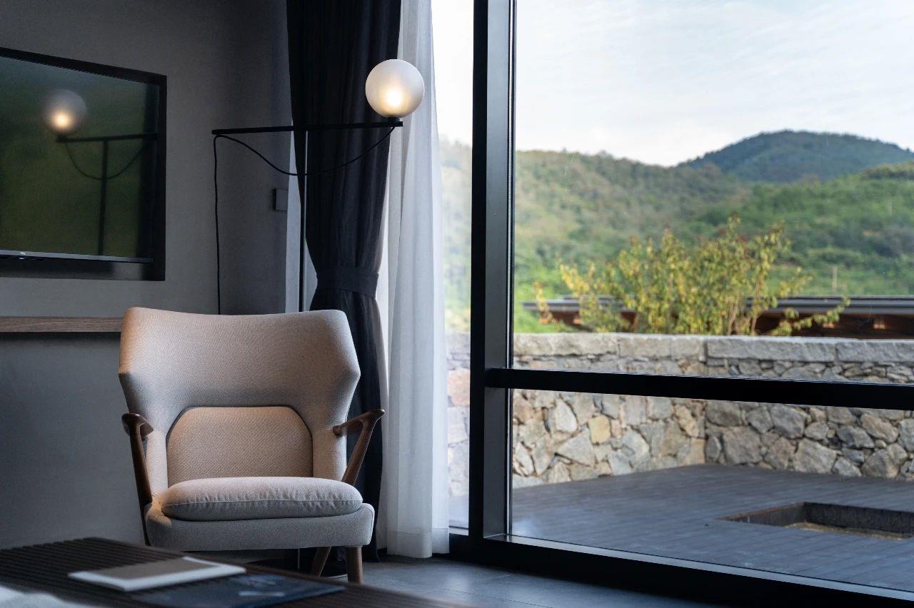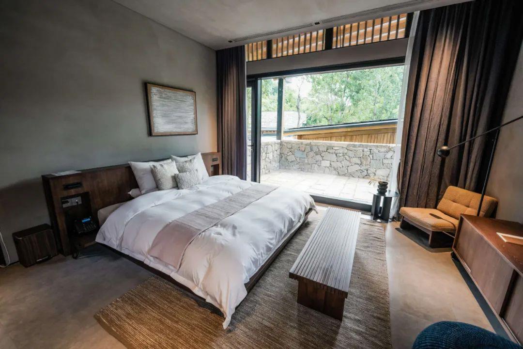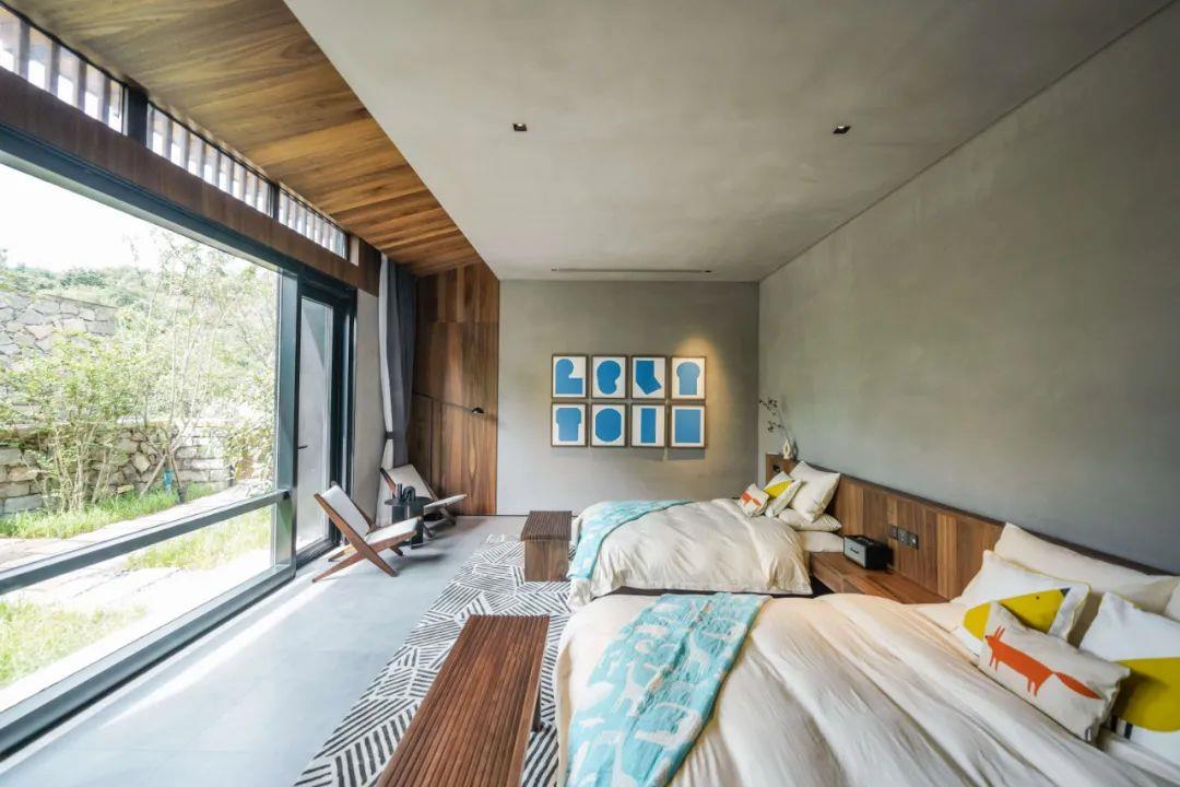 這里以設計輝映人性,以情懷觸底心靈。低調外觀隱身深山,復古場域締造完美度假時光。水泥墻、在地石材、木材橫梁、野奢感十足的復古場域。偏冷色的主色配以木質家具,點綴出不浮躁的安穩(wěn)感。到處可見的圖書與文化產品,像從酒店里長出來的一樣,從各個方向伸展、交錯,觸手可及都是書籍,目光所至盡是詩意。山林中整片綠意與光線透過大玻璃落地窗撒入房間,為這里注入自然與溫暖,新與舊、山與水、故鄉(xiāng)與遠方的融合,極富靈魂。