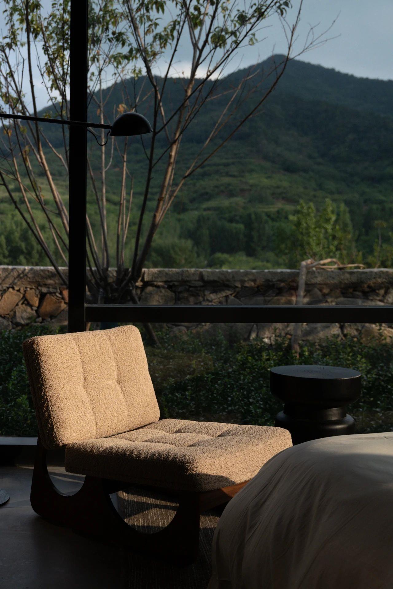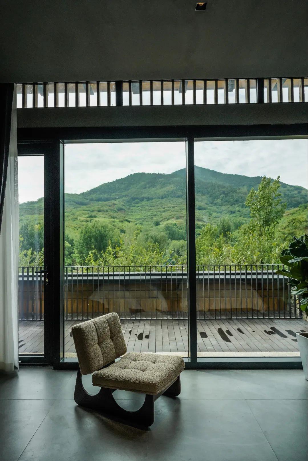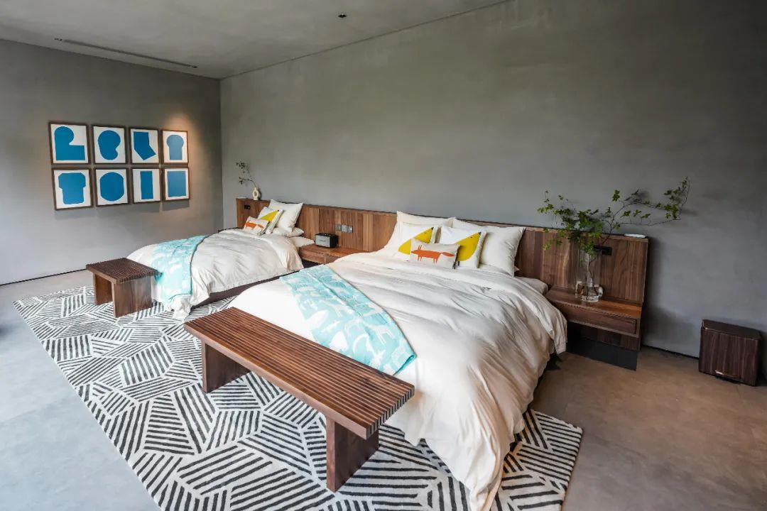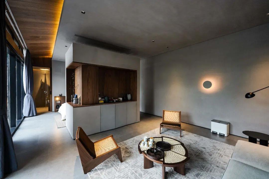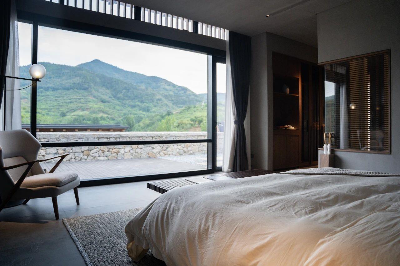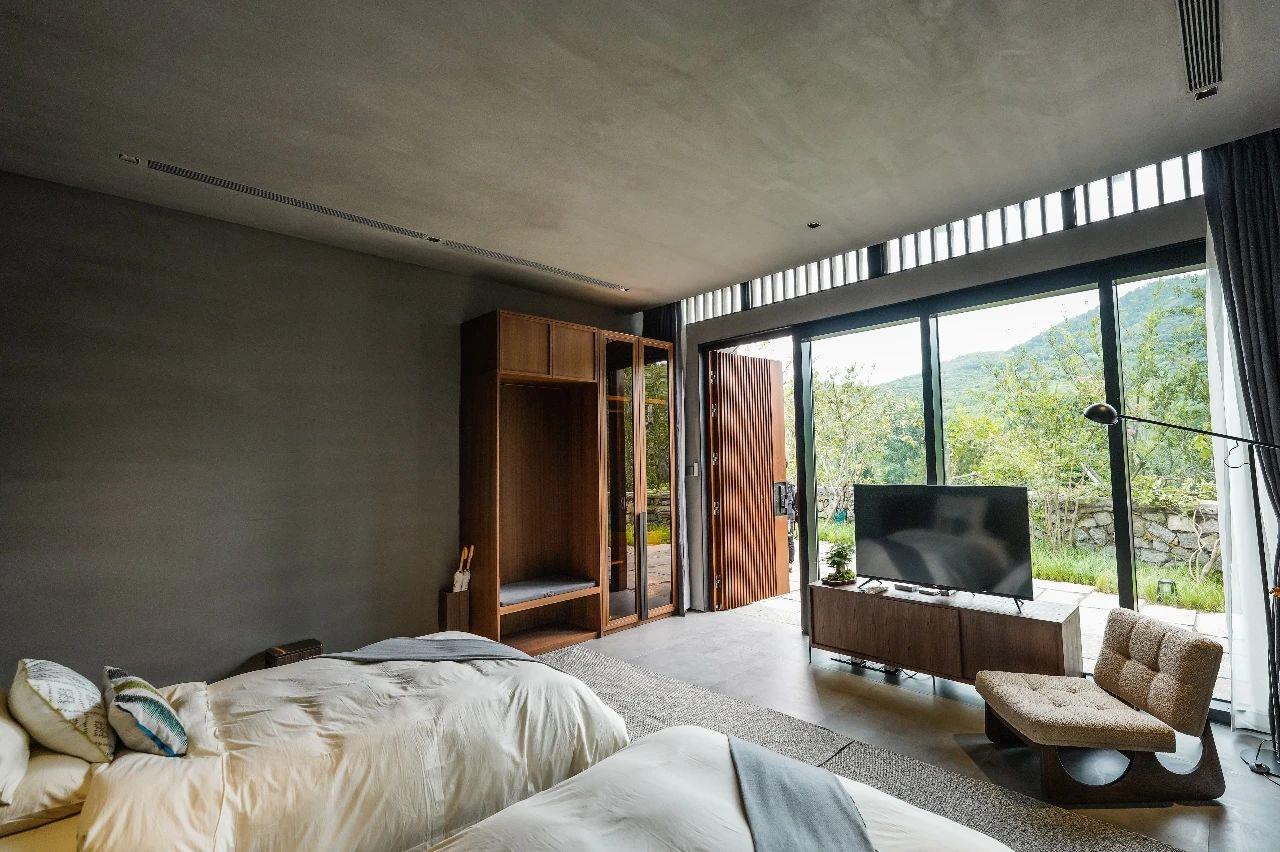 這里以設計輝映人性,以情懷觸底心靈。低調外觀隱身深山,復古場域締造完美度假時光。水泥墻、在地石材、木材橫梁、野奢感十足的復古場域。偏冷色的主色配以木質家具,點綴出不浮躁的安穩(wěn)感。到處可見的圖書與文化產品,像從酒店里長出來的一樣,從各個方向伸展、交錯,觸手可及都是書籍,目光所至盡是詩意。山林中整片綠意與光線透過大玻璃落地窗撒入房間,為這里注入自然與溫暖,新與舊、山與水、故鄉(xiāng)與遠方的融合,極富靈魂。
