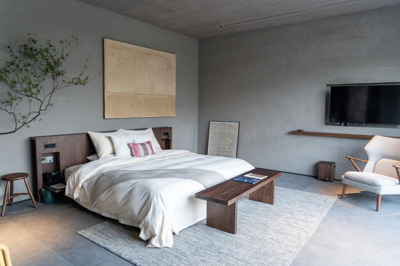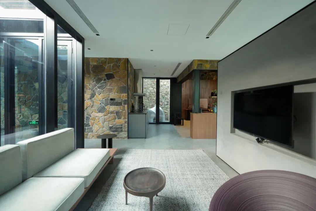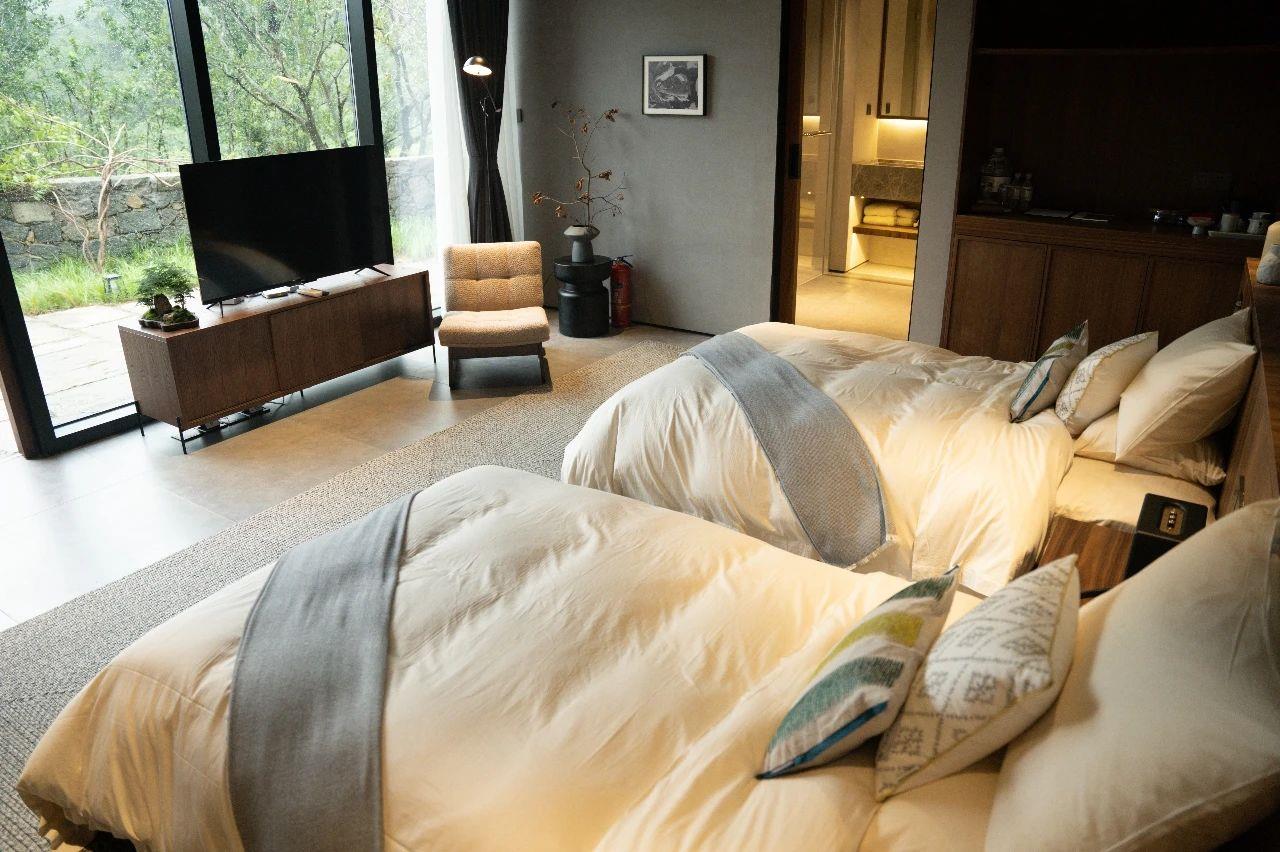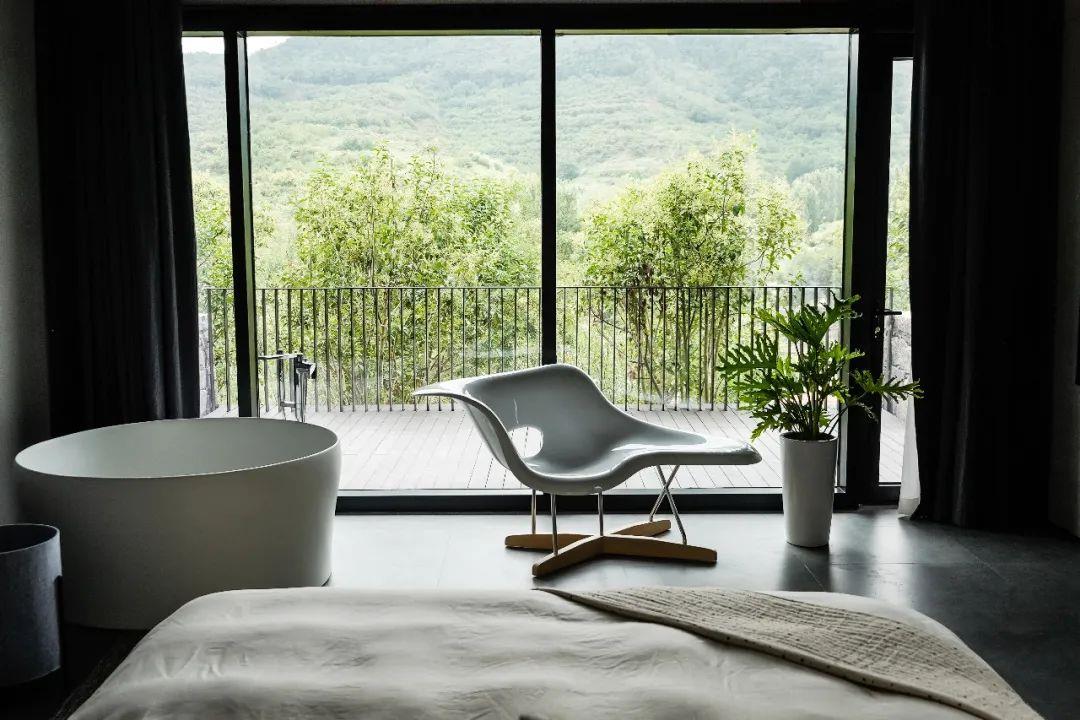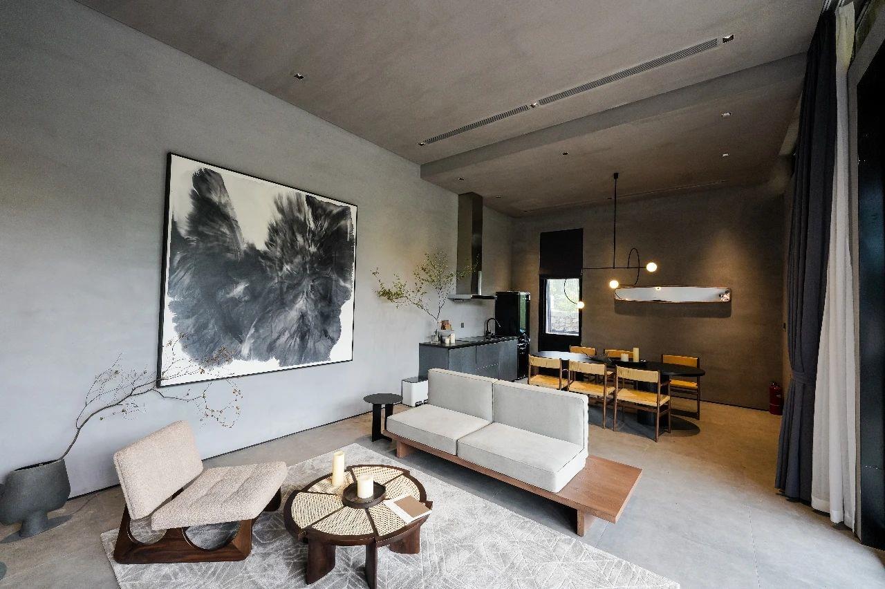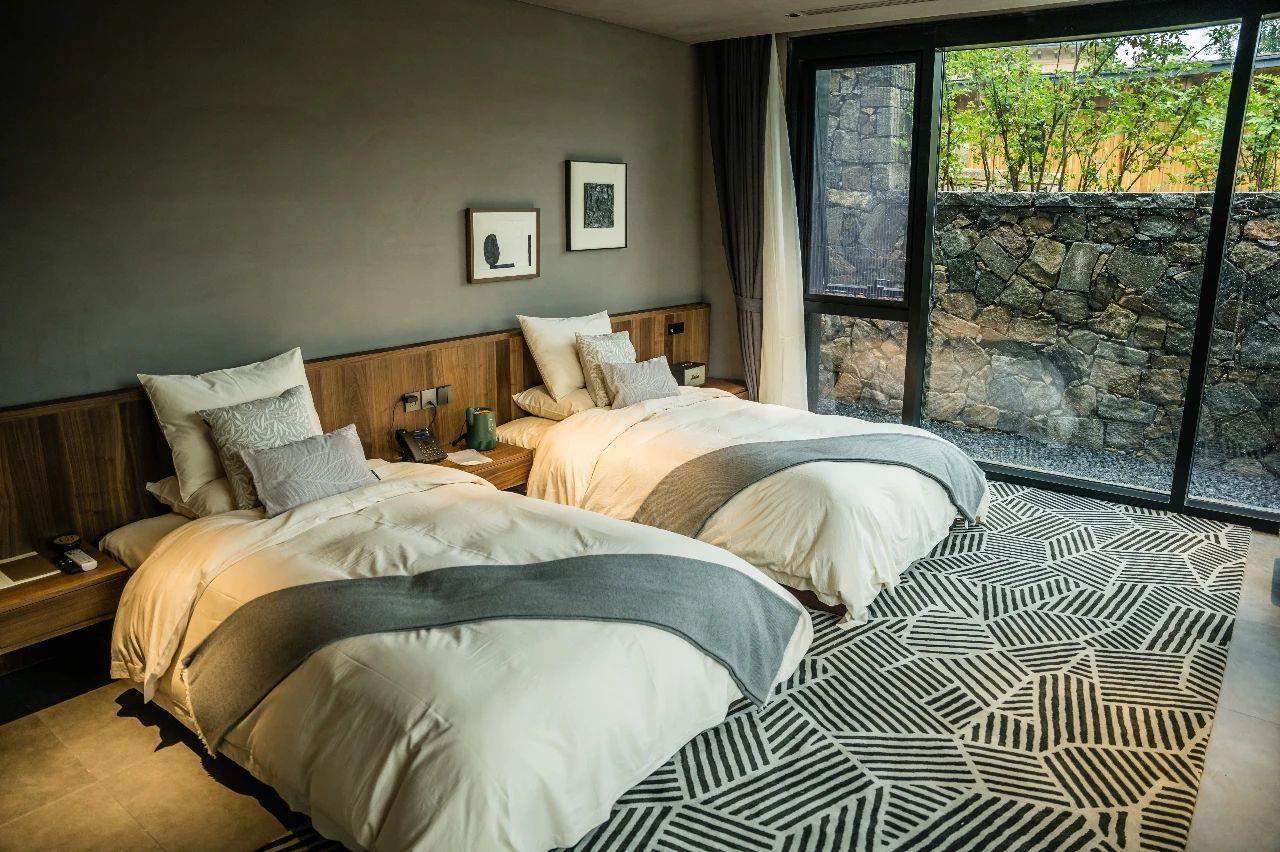 這里以設計輝映人性,以情懷觸底心靈。低調外觀隱身深山,復古場域締造完美度假時光。水泥墻、在地石材、木材橫梁、野奢感十足的復古場域。偏冷色的主色配以木質家具,點綴出不浮躁的安穩(wěn)感。到處可見的圖書與文化產品,像從酒店里長出來的一樣,從各個方向伸展、交錯,觸手可及都是書籍,目光所至盡是詩意。山林中整片綠意與光線透過大玻璃落地窗撒入房間,為這里注入自然與溫暖,新與舊、山與水、故鄉(xiāng)與遠方的融合,極富靈魂。