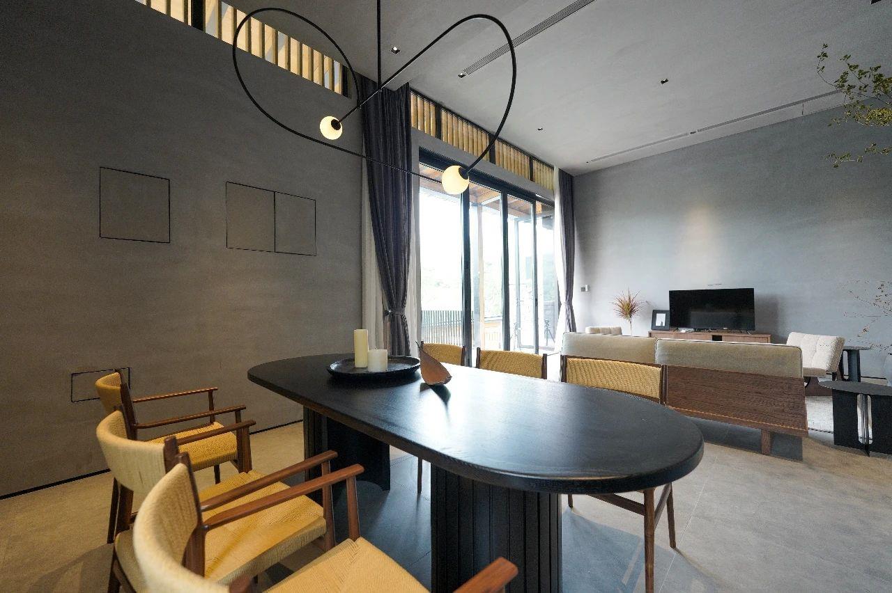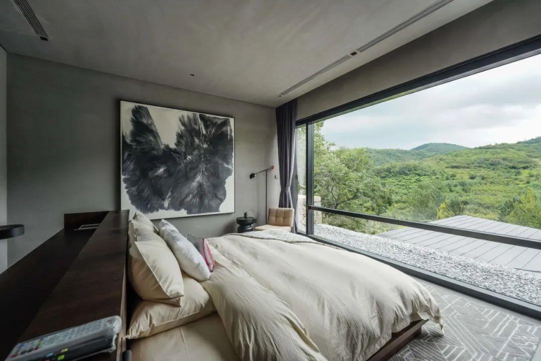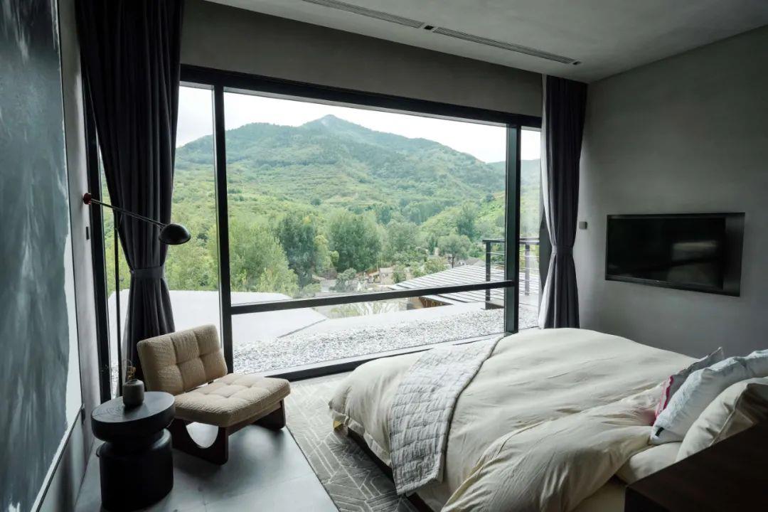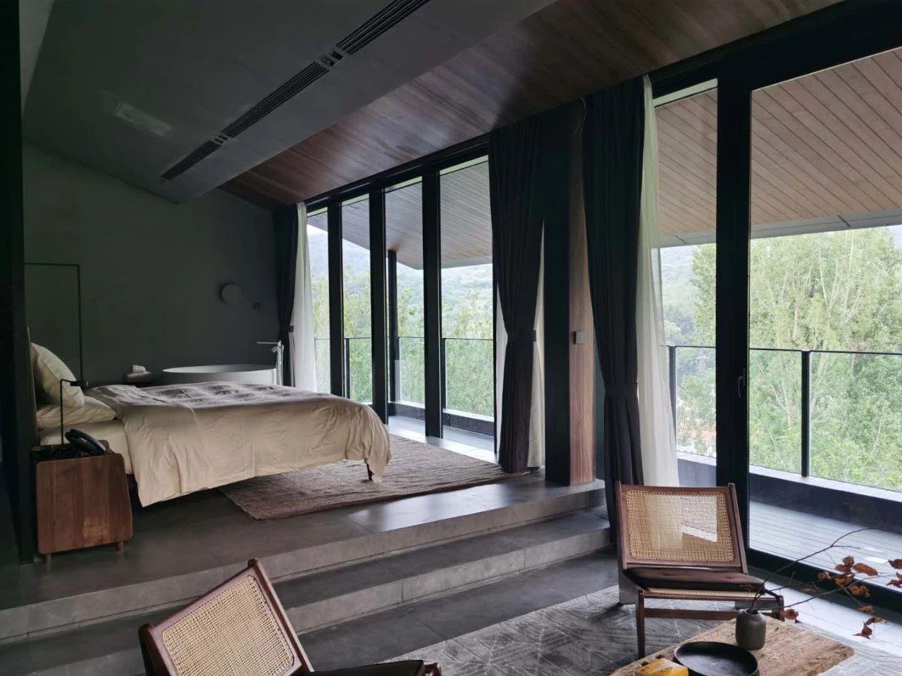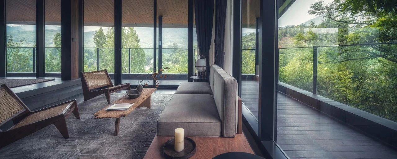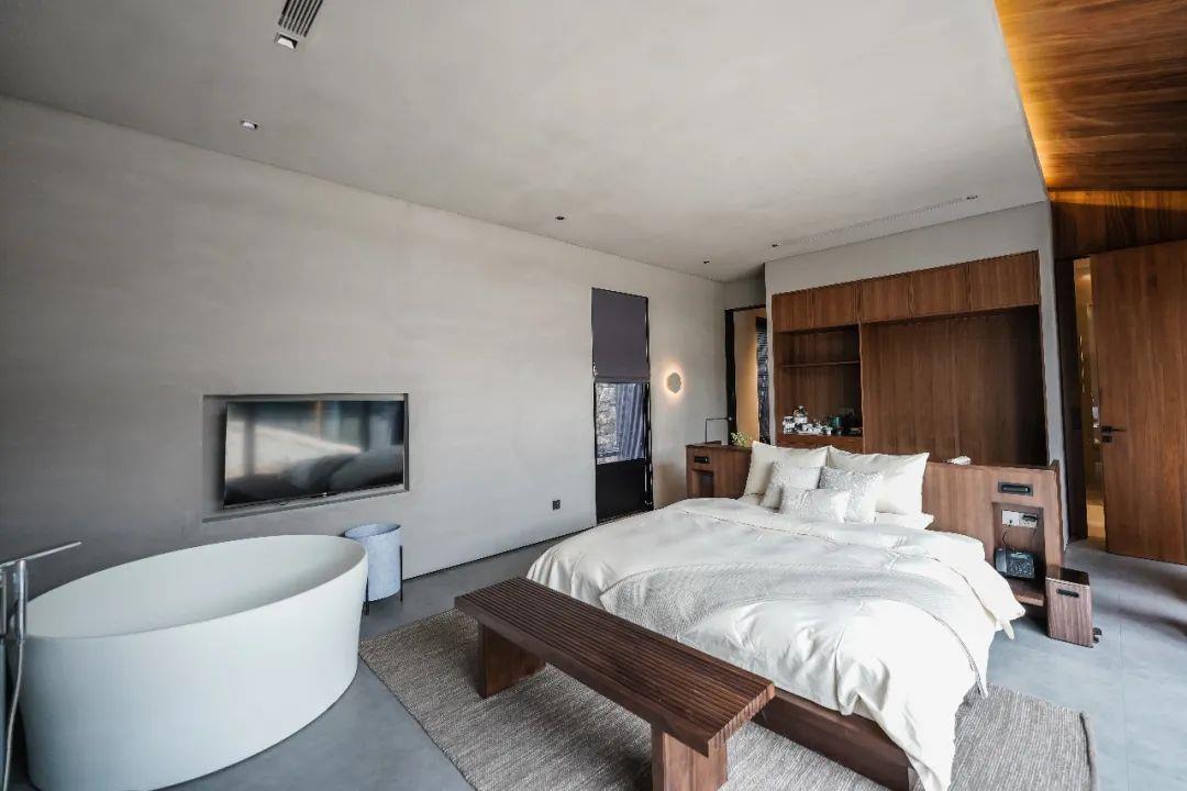這里以設計輝映人性,以情懷觸底心靈。低調外觀隱身深山,復古場域締造完美度假時光。水泥墻、在地石材、木材橫梁、野奢感十足的復古場域。偏冷色的主色配以木質家具,點綴出不浮躁的安穩(wěn)感。到處可見的圖書與文化產品,像從酒店里長出來的一樣,從各個方向伸展、交錯,觸手可及都是書籍,目光所至盡是詩意。山林中整片綠意與光線透過大玻璃落地窗撒入房間,為這里注入自然與溫暖,新與舊、山與水、故鄉(xiāng)與遠方的融合,極富靈魂。
