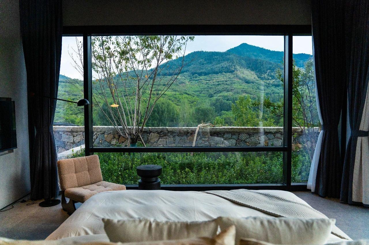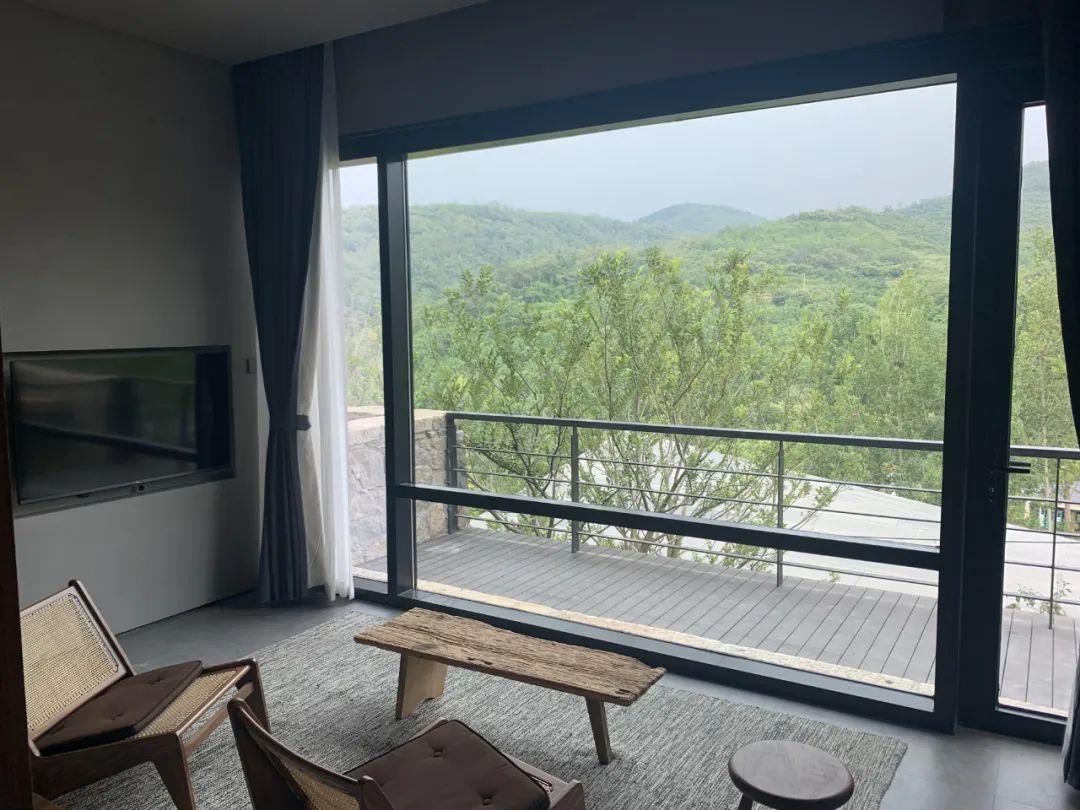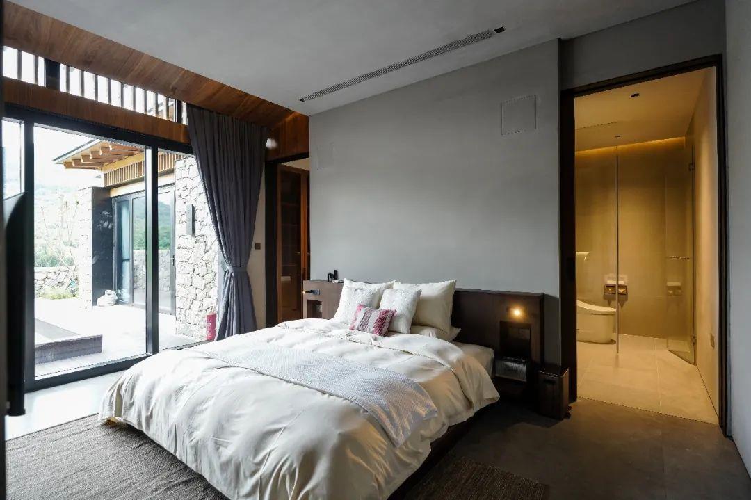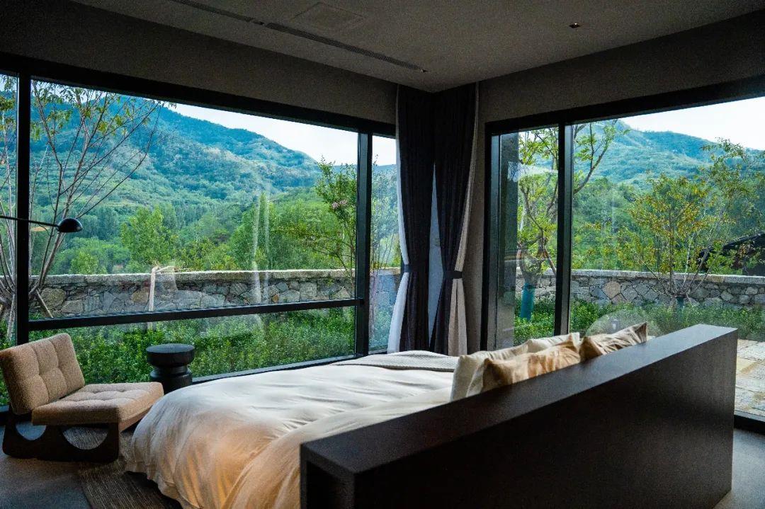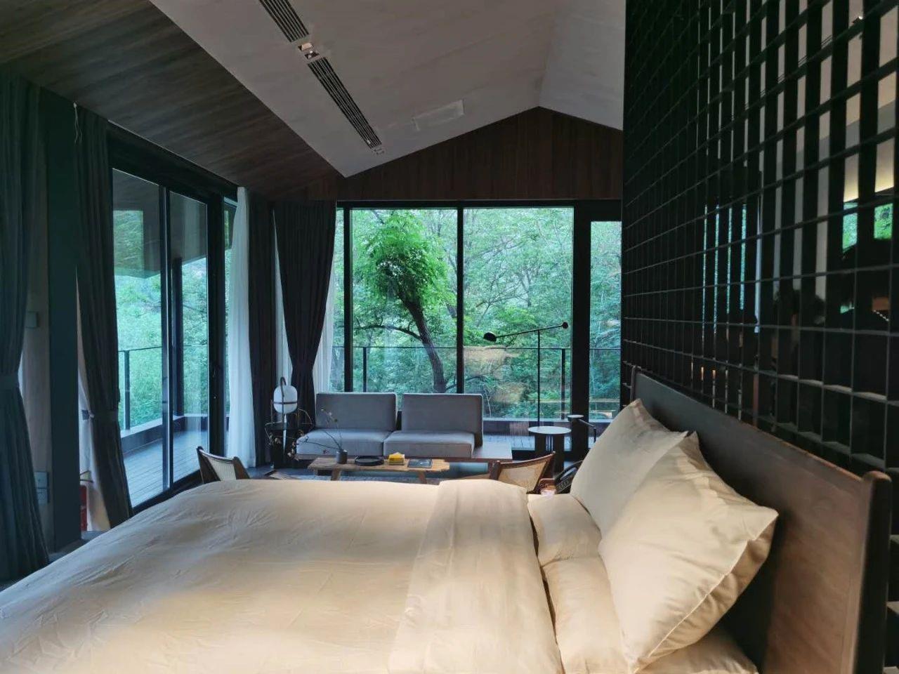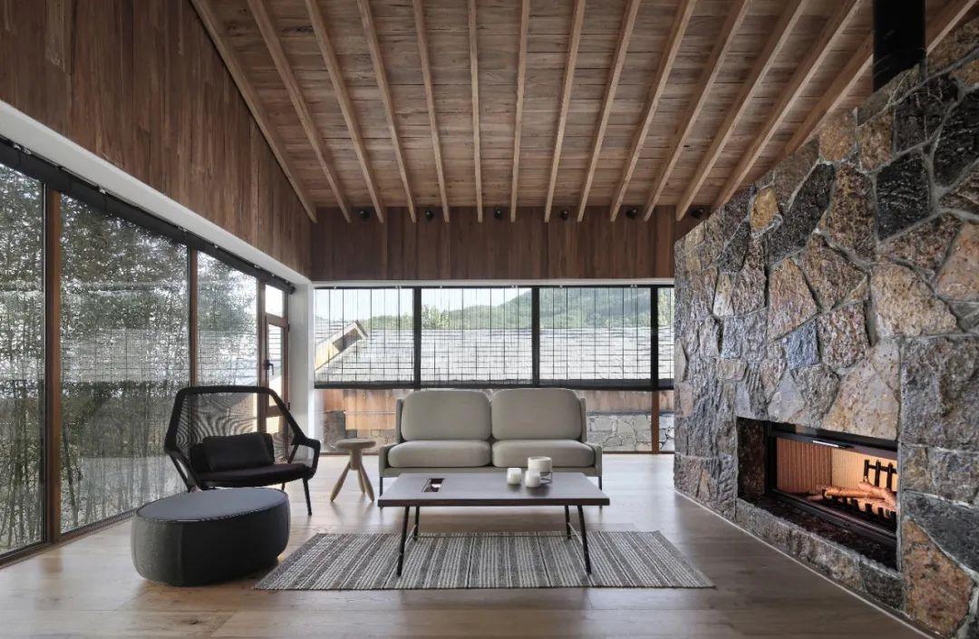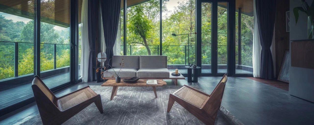 這里以設計輝映人性,以情懷觸底心靈。低調外觀隱身深山,復古場域締造完美度假時光。水泥墻、在地石材、木材橫梁、野奢感十足的復古場域。偏冷色的主色配以木質家具,點綴出不浮躁的安穩(wěn)感。到處可見的圖書與文化產品,像從酒店里長出來的一樣,從各個方向伸展、交錯,觸手可及都是書籍,目光所至盡是詩意。山林中整片綠意與光線透過大玻璃落地窗撒入房間,為這里注入自然與溫暖,新與舊、山與水、故鄉(xiāng)與遠方的融合,極富靈魂。
