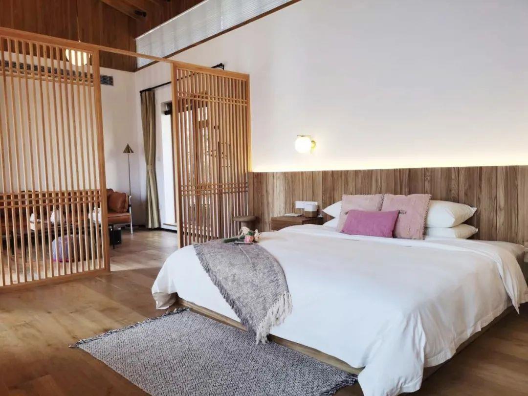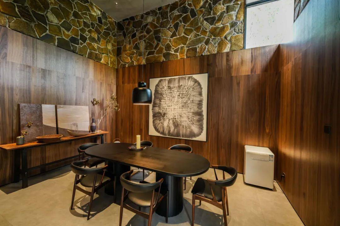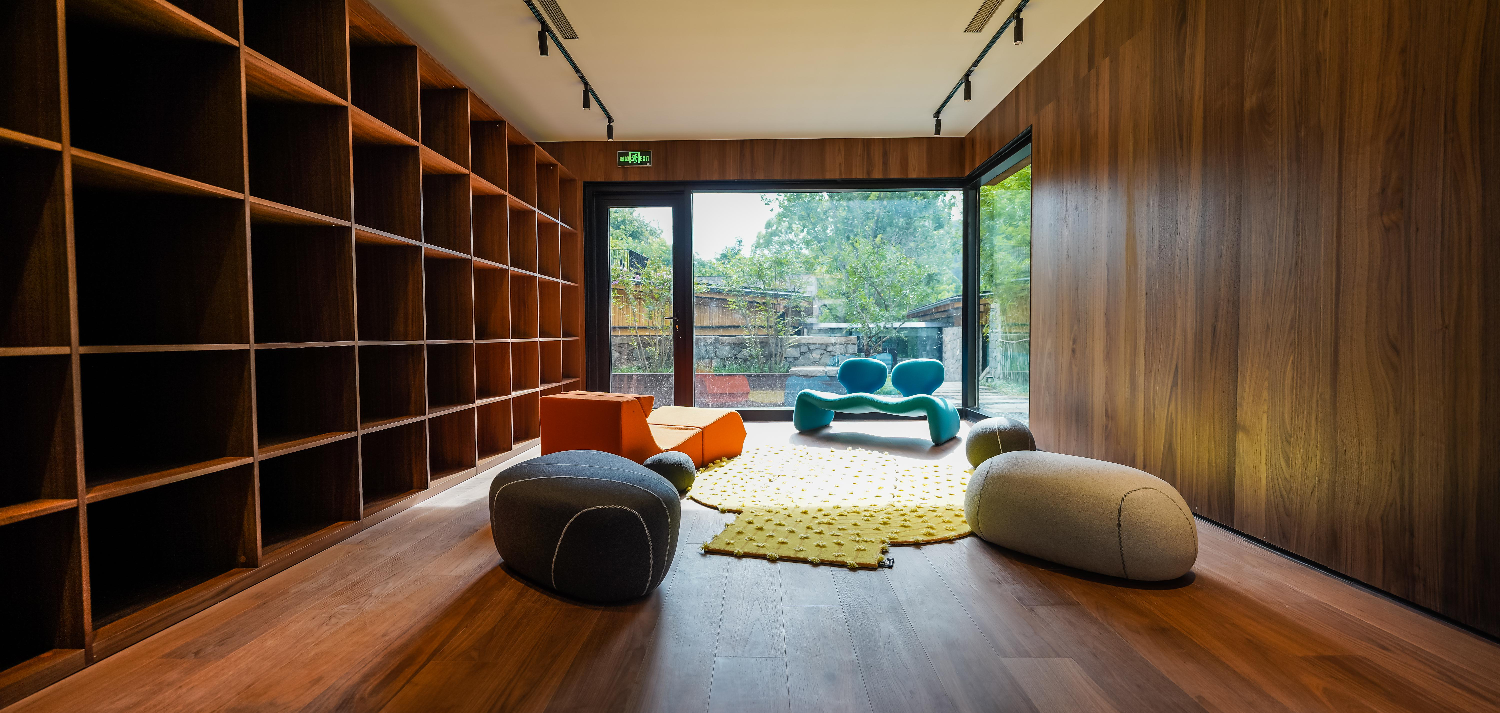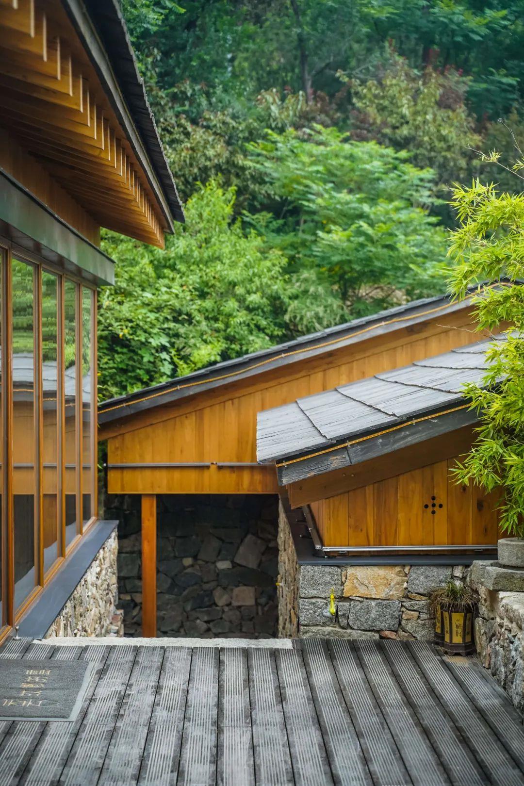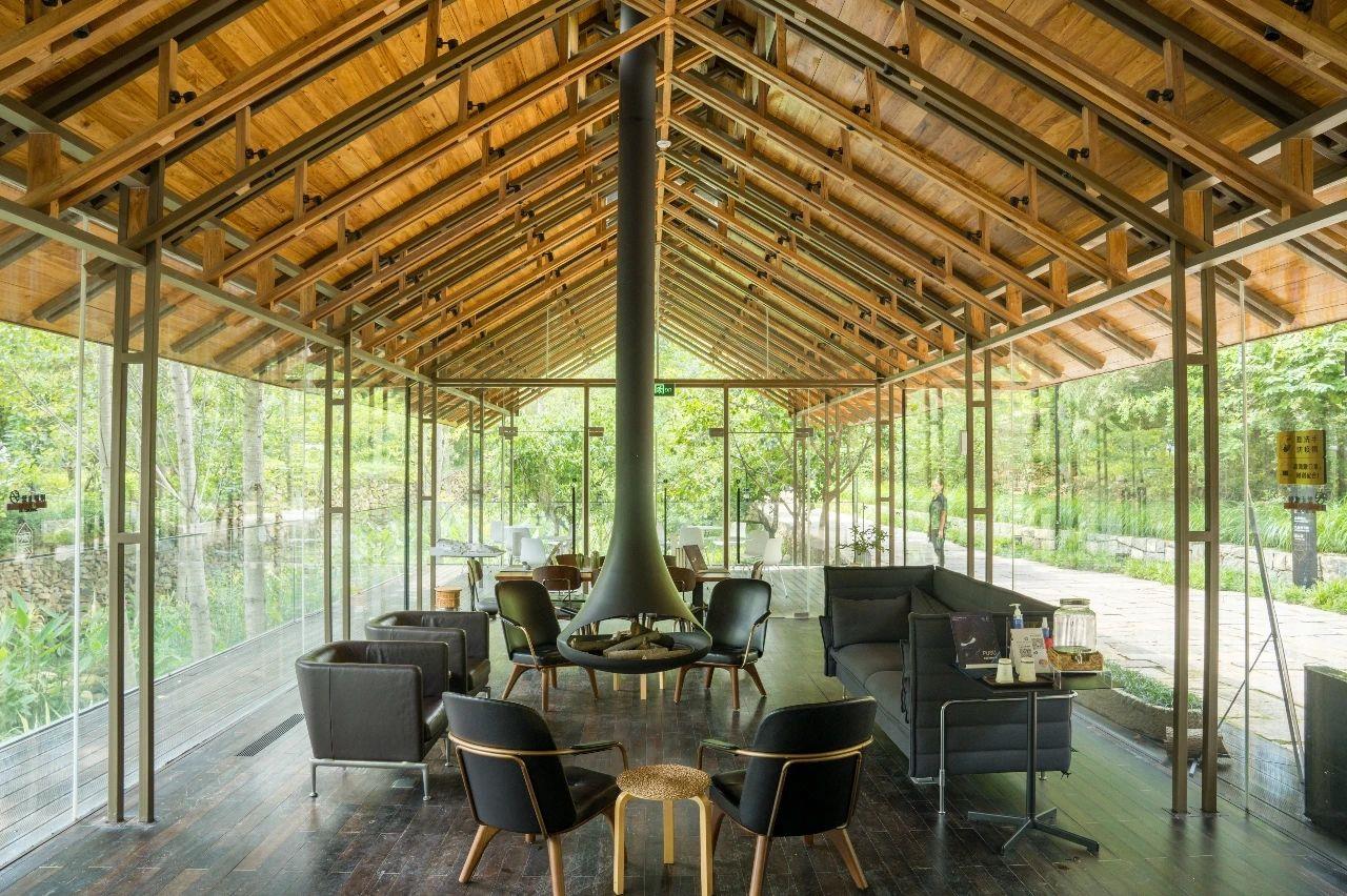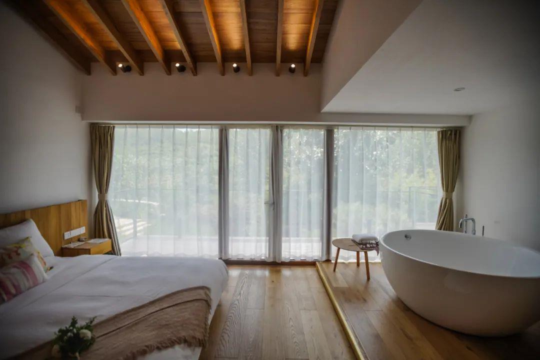 這里以設計輝映人性,以情懷觸底心靈。低調外觀隱身深山,復古場域締造完美度假時光。水泥墻、在地石材、木材橫梁、野奢感十足的復古場域。偏冷色的主色配以木質家具,點綴出不浮躁的安穩(wěn)感。到處可見的圖書與文化產品,像從酒店里長出來的一樣,從各個方向伸展、交錯,觸手可及都是書籍,目光所至盡是詩意。山林中整片綠意與光線透過大玻璃落地窗撒入房間,為這里注入自然與溫暖,新與舊、山與水、故鄉(xiāng)與遠方的融合,極富靈魂。