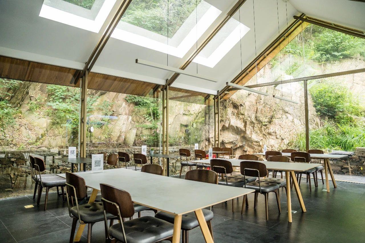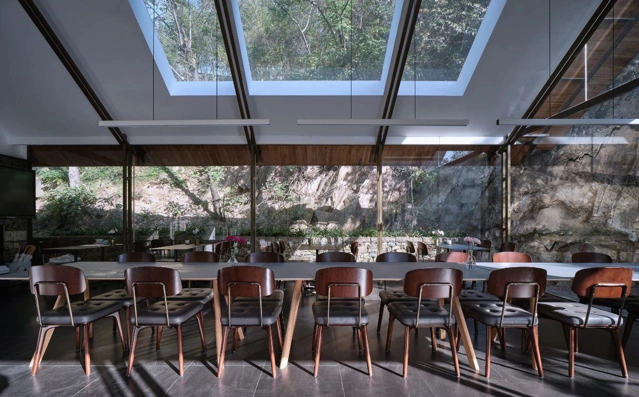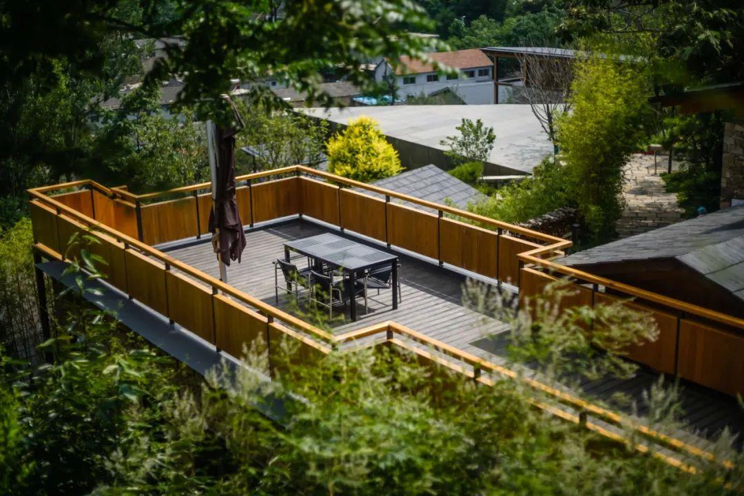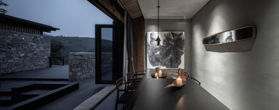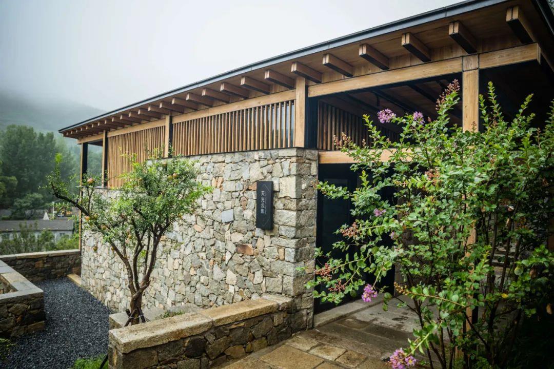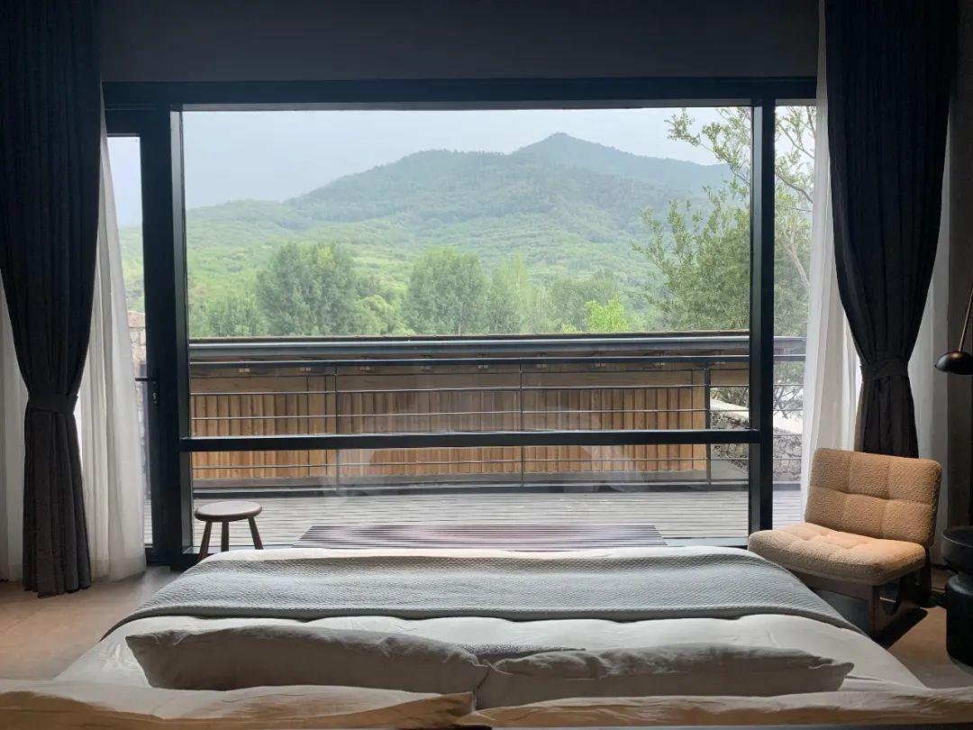 這里以設計輝映人性,以情懷觸底心靈。低調外觀隱身深山,復古場域締造完美度假時光。水泥墻、在地石材、木材橫梁、野奢感十足的復古場域。偏冷色的主色配以木質家具,點綴出不浮躁的安穩(wěn)感。到處可見的圖書與文化產品,像從酒店里長出來的一樣,從各個方向伸展、交錯,觸手可及都是書籍,目光所至盡是詩意。山林中整片綠意與光線透過大玻璃落地窗撒入房間,為這里注入自然與溫暖,新與舊、山與水、故鄉(xiāng)與遠方的融合,極富靈魂。