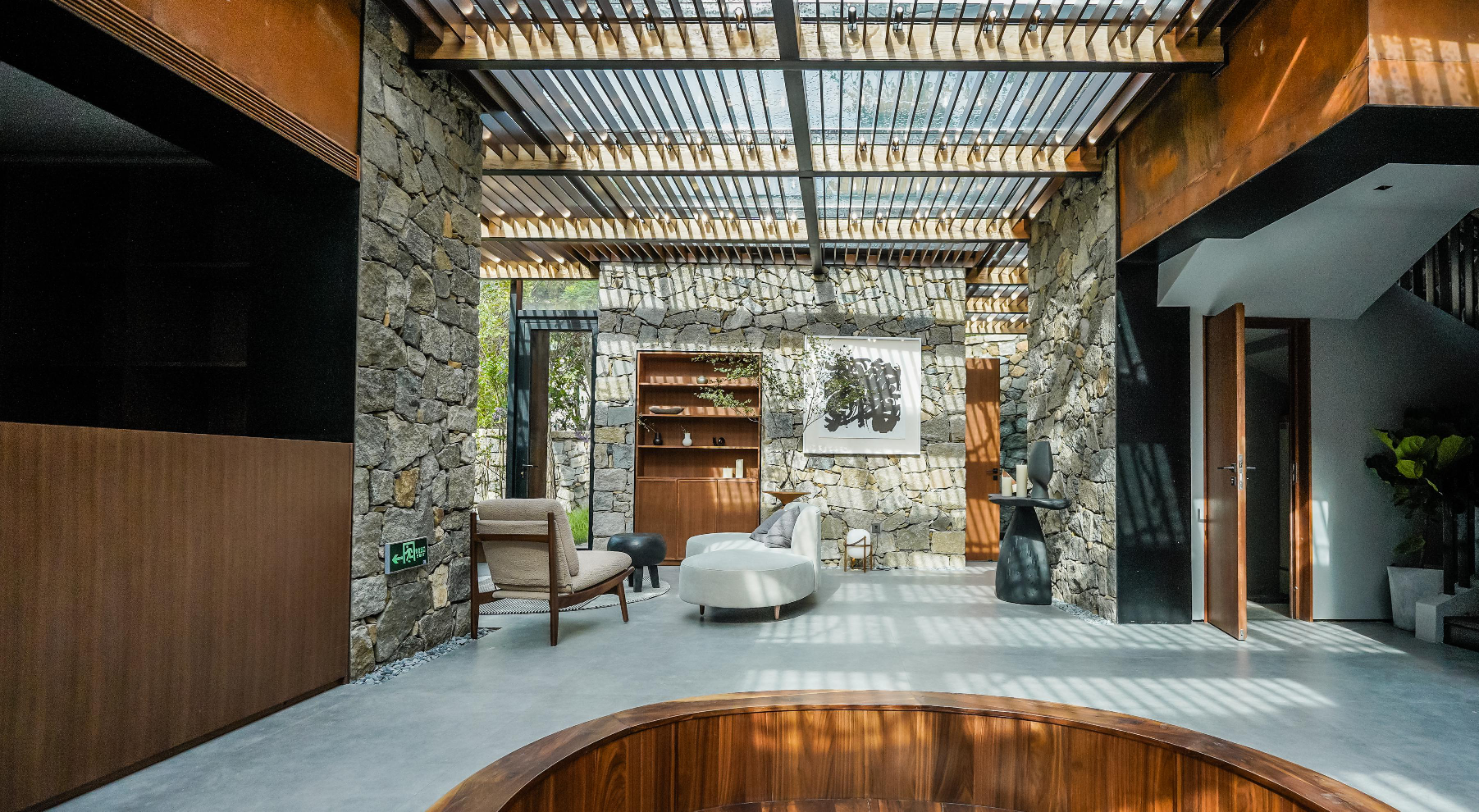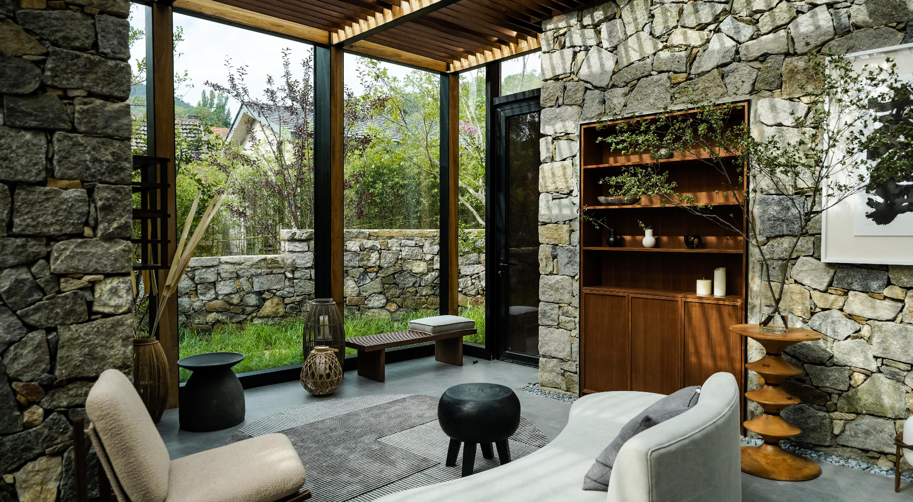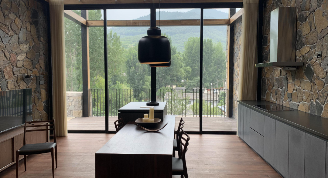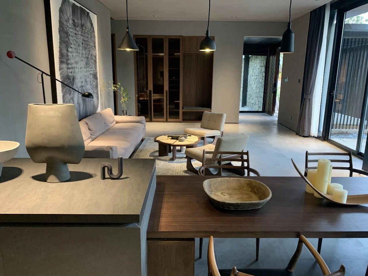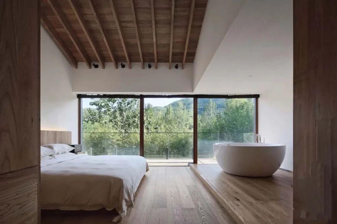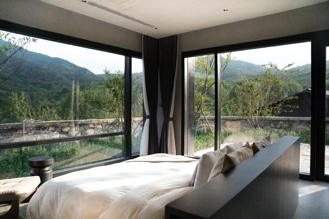 這里以設計輝映人性,以情懷觸底心靈。低調外觀隱身深山,復古場域締造完美度假時光。水泥墻、在地石材、木材橫梁、野奢感十足的復古場域。偏冷色的主色配以木質家具,點綴出不浮躁的安穩(wěn)感。到處可見的圖書與文化產品,像從酒店里長出來的一樣,從各個方向伸展、交錯,觸手可及都是書籍,目光所至盡是詩意。山林中整片綠意與光線透過大玻璃落地窗撒入房間,為這里注入自然與溫暖,新與舊、山與水、故鄉(xiāng)與遠方的融合,極富靈魂。
